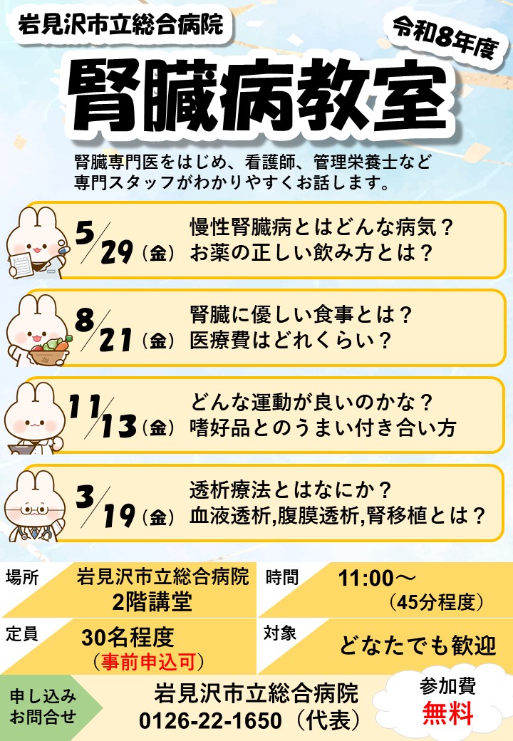 全件 重要なお知らせ お知らせ 休診情報 採用情報 トピックス 令和8年度腎臓病教室の開催について 令和8年度腎臓病教室を開催します 慢性腎臓病透析予防チームの取り組みとして腎臓病教室を今年も4回開催いたします。 定員を30名まで増やし、対象者もすべての方へ拡大いたしましたので、ご興味のある方は是非ご参加ください。 定員になり次第締め切りとなります。 お電話又は来院にて事前申し込みが可能ですので、ご活用ください。 令和7年度腎臓病教室の様子